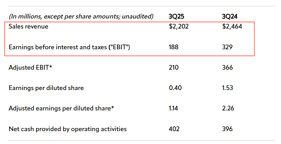 具体来看业绩,2025年第三季度销售收入22.02亿美元,同比下降11%(销量/产品组合下降10%以及售价下降1%),销量/产品组合下降主要原因是非必需消费品终端市场疲软,以及客户消化了上半年因关税影响而预先囤积的库存,尤其是在先进材料和纤维领域,预计大部分预购库存将在今年年底前消耗完毕。
