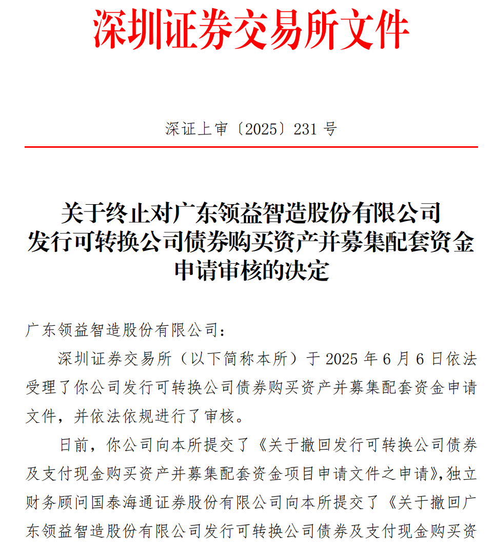根据《深圳证券交易所上市公司重大资产重组审核规则》第五十二条的有关规定,深交所决定终止对领益智造发行可转换公司债券购买资产并募集配套资金申请的审核。