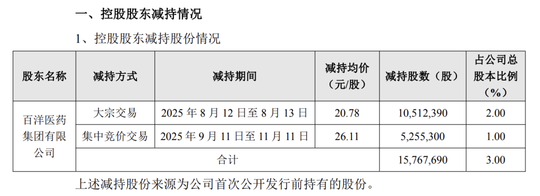 公告显示,2025年8月12日至11月11日百洋医药控股股东百洋医药集团有限公司(以下简称“百洋集团”)通过大宗交易及集中竞价交易合计减持公司15,767,690股股份,占公司总股本比例为3%。